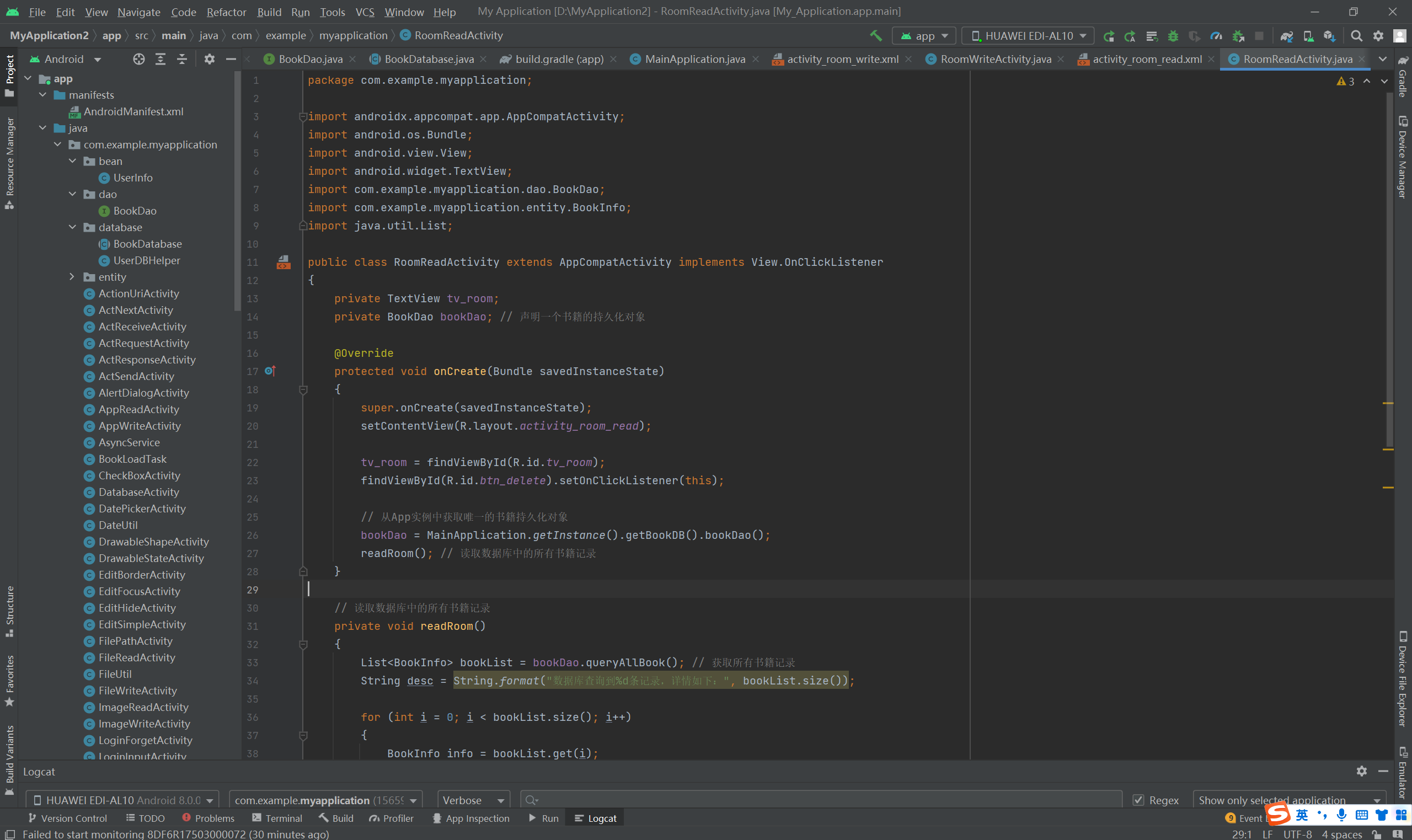 - public class RoomReadActivity extends AppCompatActivity implements View.OnClickListener