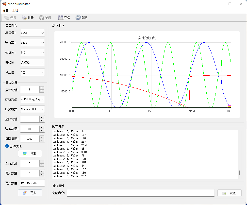 这里我们读取从站从地址0开始的10个保持寄存器,并将值显示在消息框和图形中。我们模拟了2路正弦信号、1路抛物线信号和5路固定值信号。接下来我们测试一下写操作。测试的结果如下图所示: