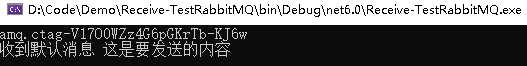 ... var channel = connection.CreateModel(); var consumer = new EventingBasicConsumer(channel); consumer.Received += (model, ea) => { var message = Encoding.UTF8.GetString(ea.Body.ToArray()); Console.WriteLine("收到默认消息 {0}", message); }; string msg = channel.BasicConsume(queue: "FirstQueue", autoAck: true, consumer: consumer);
