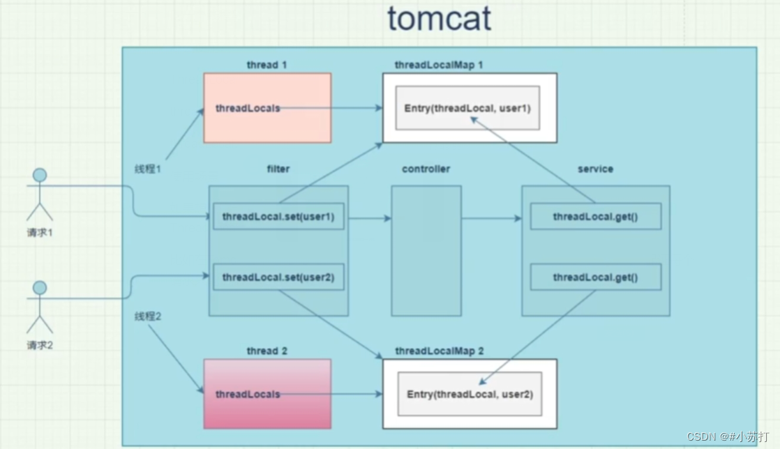 在Tomcat中,如果我们想在 filter,controller,service之间方便的去共享数据,并且保证每个请求只能访问自己的数据,此时可以使用ThreadLocal