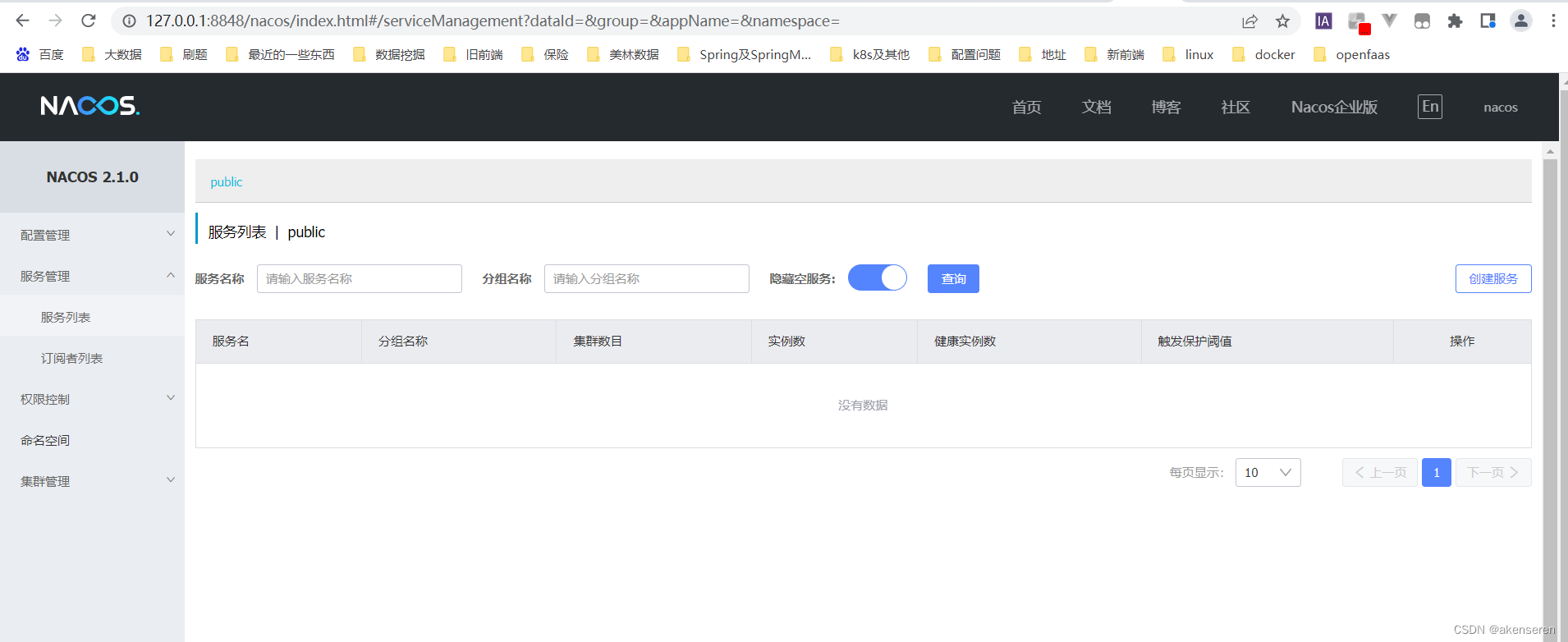 nacos的根路径为/nacos,默认端口号为8848。因此后台的访问路径为:http://localhost:8848/nacos