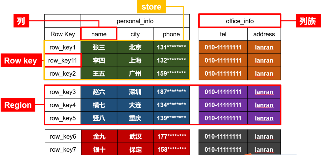HBase中的每个列都由Column Family(列族)和Column Qualifier(列限定符)进行限定,例如info:name,info:age。建表时,只需指明列族,而列限定符无需预先定义
