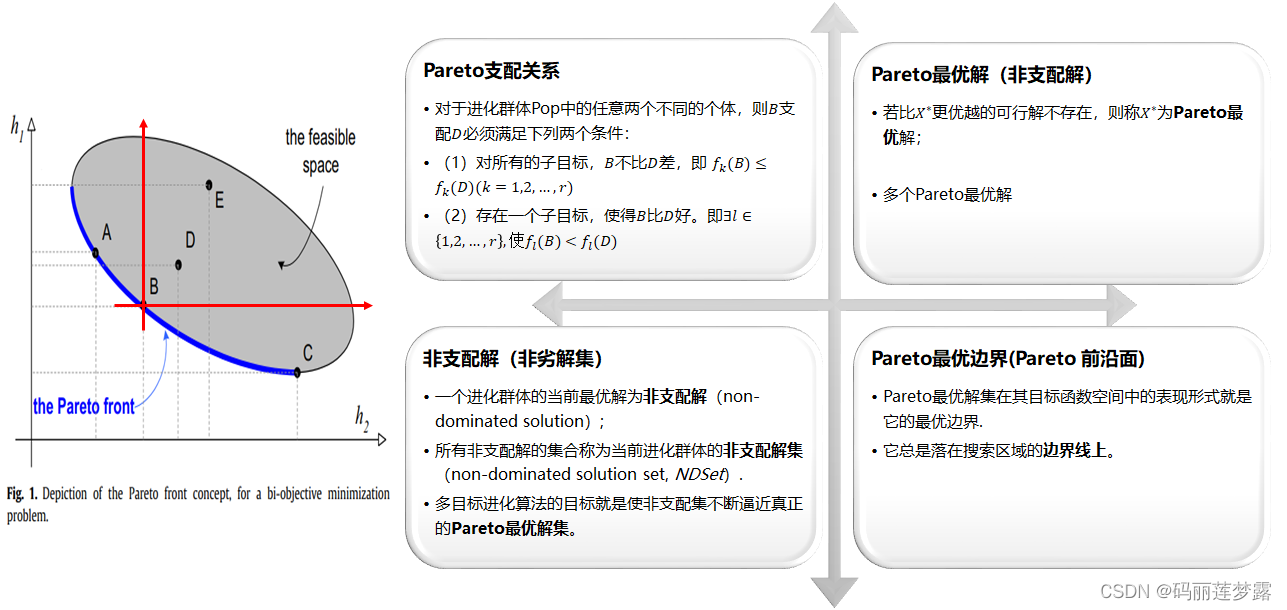 3.1.1的方法在低维度中可以使用,但在高维目标空间中,权重向量的数量特别多,例如,目标数量为7个时,我们令H=7,那么以上面的方法权重向量的组合数为 two-layer权重向量生成方法将权重向量分为两层:边界层( 边界层的权重向量根据上述方法得到, 通常,我们取 将多个目标聚合的方式有多种,包括线性的多目标加权或者非线性聚合方法,下面介绍分解策略中三类常用的聚合函数。 这是一种线性聚合方法,下式 注:等值线表示在线上的所有可行解的目标函数值都相等。 由下面两个图可以见得,当真实的Pareto前沿面为凸状时,单个最优等值线与Pareto前沿面相交于一个切点,即权重聚合方法的最优解。当真实Pareto前沿面为凹状(右图,两图的优化目标都是最小化),权重聚合函数的最优解位于Pareto面的边缘区域,这是因为位于Pareto面的中间部分的解具有较差的适应度值。因此,权重聚合方法不能很好的处理真实Pareto面为凹状的问题。 切比雪夫方法是一种非线性聚合方法,与权重聚合方法的加权和不同,在计算目标函数值前,需要计算种群中截至目前为止的各目标取得的最小值作为参考点 为什么是直角锯齿状?(个人理解,可能表述不太好,见谅) 当在 具有与 且 那么符合这个要求的可行解个体在与 同理,在 直观上看,在连续Pareto面情形下,切比雪夫子问题的最优解为方向向量(与权重向量垂直)与Pareto面的交点。在非连续Pareto面情形下,对应不同权重向量的子问题可能具有相同的最优解,这是因为方向向量与Pareto面没有交点。在处理高维问题时,切比雪夫方法限制收敛接受区域,因而能更好的保证种群的收敛性。 交叉边界法(BI)主要是为连续多目标优化问题设计的,可以用于处理非凸Pareto前沿面的多目标优化问题。其中等式约束 基于惩罚的交叉边界法放宽了对可行解的要求,但加入了一个惩罚措施,即如果不在权重向量方向上就要接受惩罚,距离权重向量越远,惩罚越厉害,惩罚力度通过 参考文献:Q. Zhang and H. Li, "MOEA/D: A Multiobjective Evolutionary Algorithm Based on Decomposition," in IEEE Transactions on Evolutionary Computation, vol. 11, no. 6, pp. 712-731, Dec. 2007, doi: 10.1109/TEVC.2007.892759. 输入:多目标优化问题、停止准则、优化目标数N、均匀分布的权重向量、每个权重向量邻居数T 输出:非支配解集EP 伪代码及算法流程步骤如下: 步骤1:产生初始化种群P; 步骤2:选择某个进化算法(如遗传算法)对P执行进化操作(如交叉、变异和选择),得到新的进化种群R; 步骤3:采用某种策略构造P∪R的非支配集NDSet,一般情况下在设计算法时已经设置了非支配集的大小(如N)。 步骤4:若当前非支配集NDSet的大小大于或小于N时,需要按照某种策略对NDSet进行调整,调整时一方面使NDSet满足大小要求,同时也必须使NDSet满足分布性要求; 步骤5:判断终止条件,否则,迭代。 下面以个人所写的NSGA-Ⅱ的主程序为例,以作展示: 决定基于Pareto的MOEA的关键点在于: (1)如何选择构造非支配集的方法 (2)采用什么策略来调整非支配集的大小 (3)如何保持非支配集的分布性 最具代表性的基于支配的MOEA是:NSGA-Ⅱ,其算法流程如下: 详细的问题描述可见之前我之前的博文,不同的调度的目标在完工时间最小的基础上增加了最小化最大机器负荷和最小化机器总负荷。 用python实现改遗传算法解柔性作业车间调度问题的编码和初始化_码丽莲梦露的博客-CSDN博客_遗传算法车间调度编码 完整代码已上传至个人Github,可供大家参考:Aihong-Sun/MOEA-D-and-NSGA--for-FJSP: this repo has use MOEA/D and NSGA-Ⅱ to solve multi-objective FJSP problem (github.com) Env_JSP_FJSP:(用于搭建作业车间/柔性作业车间的环境) (1)Job.py (2)Machine.py (3)Job_Shop.py Algorithms: (1)Popi.py (一个个体,用于保存一个可行解的各种特征) (2)utils.py (包含一个多目标的通用工具算子) (3)Algorithms.py (包含MOEA/D和NSGA两种算法) (4)Params.py (包含算法及问题的相关参数) 运行规模及相关参数设置如下,运行次数为1: 注1:求解结果有待进一步改进,此处仅用作算法演示,具体改进可以相互交流。 注2:下面图很多,只是算例不同,至于为什么选那几个图,是因为我觉得看着好看,哈哈哈哈,所有结果可见上面提供的Github中,每个算例的结果都有。 此篇博文的完整代码已上传至个人Github,可供大家参考:Aihong-Sun/MOEA-D-and-NSGA--for-FJSP: this repo has use MOEA/D and NSGA-Ⅱ to solve multi-objective FJSP problem (github.com)