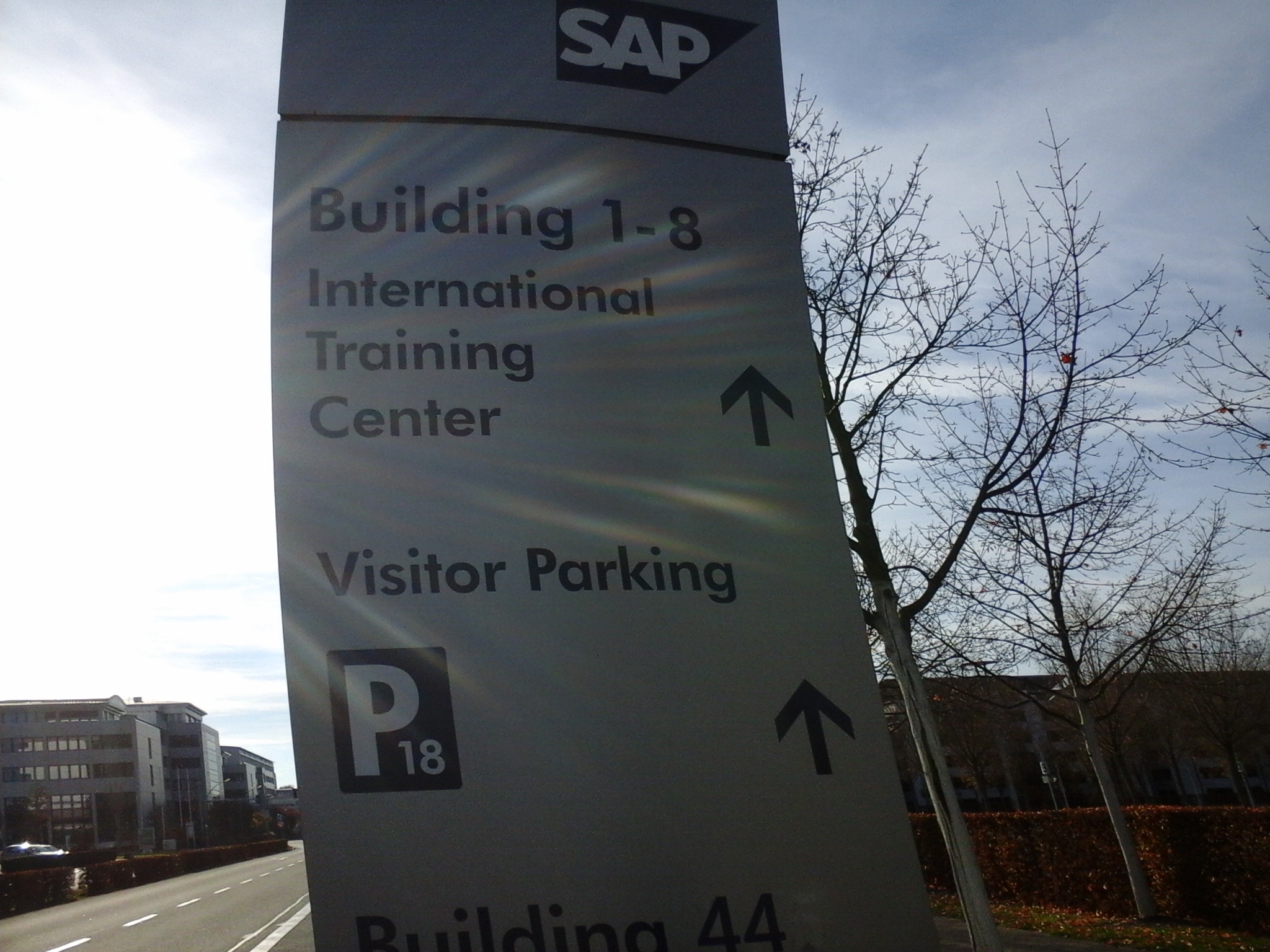 从旅店出发,步行十分钟,跨上一座大桥,就能看到远处 SAP Building 1 醒目的 Logo 了: