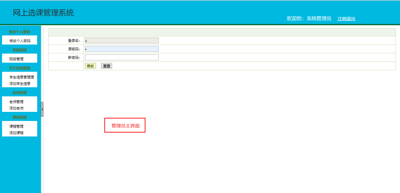 管理员:修改密码、班级管理、学生信息管理、老师管理、课程管理、课表管理(给课程添加课表,比如某一天上午1-2节课在什么教室,一个教室同一时间点只能上一门课)、选课管理。