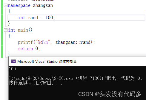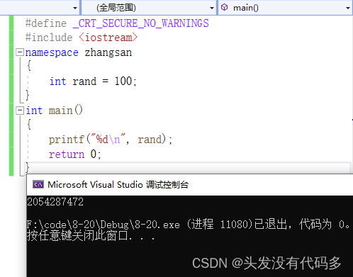 定义命名空间的时候记尽量避免冲突,但如果命名空间名称为rand就不行,因为rand是个库函数