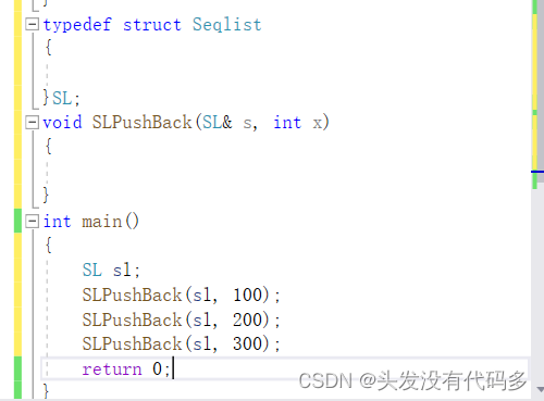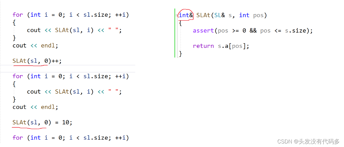 typedef struct Seqlist { int* a; int size; int capacity; }SL; void SLInit(SL& s, int capacity = 4) { s.a = (int*)malloc(sizeof(int) * capacity); s.size = 0; s.capacity = capacity; } void SLPushBack(SL& s, int x) { s.a[s.size++] = x; } //修改顺序表数据的函数 int& SLAt(SL& s, int pos) { assert(pos >= 0 && pos <= s.size); return s.a[pos]; } int main() { SL sl; SLInit(sl); SLPushBack(sl, 1); SLPushBack(sl, 2); SLPushBack(sl, 3); SLPushBack(sl, 4); for (int i = 0; i < sl.size; ++i) { cout << SLAt(sl, i) << " "; } cout << endl; SLAt(sl, 0)++; for (int i = 0; i < sl.size; ++i) { cout << SLAt(sl, i) << " "; } cout << endl; SLAt(sl, 0) = 10; for (int i = 0; i < sl.size; ++i) { cout << SLAt(sl, i) << " "; } cout << endl; return 0; }
