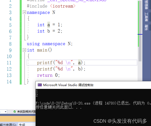 注意:早期标准库将所有功能在全局域中实现,声明在.h后缀的头文件中,使用时只需包含对应头文件即可,后来将其实现在std命名空间下,为了和C头文件区分,也为了正确使用命名空间,规定C++头文件不带.h;旧编译器(vc 6.0)中还支持格式,后续编译器已不支持,因此推荐使用 +std的方式 C++中,cout和cin可自动识别变量的类型,c语言中要用%d或%c,说明变量类型,而C++不用