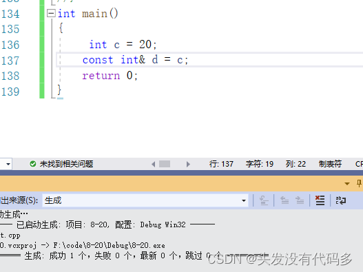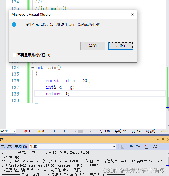 若直接对常量进行引用则会报错,这是因为 c是常量,只可读,而d是变量,可读也可写,int& d=c会把c的权限放大,权限放大会报错