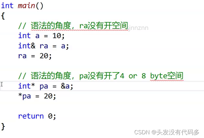3. 引用在初始化时引用一个实体后,就不能再引用其他实体,而指针可以在任何时候指向任何一个同类型