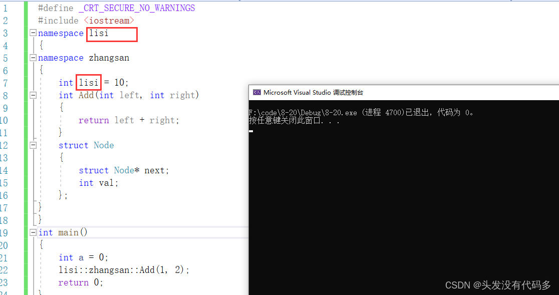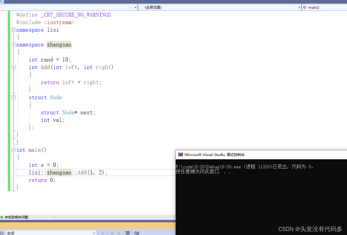 namespace zhangsan { int rand = 10; int Add(int left, int right) { return left + right; } struct Node { struct Node* next; int val; }; }