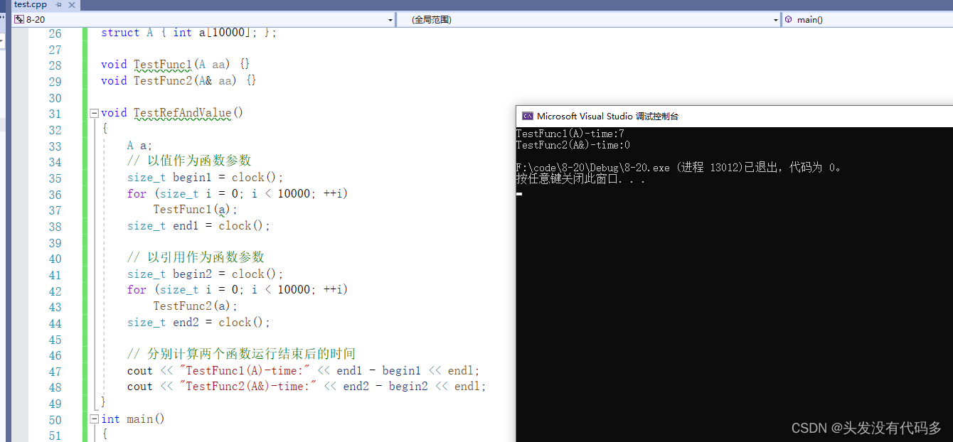 struct A { int a[10000]; }; void TestFunc1(A aa) {} void TestFunc2(A& aa) {} void TestRefAndValue() { A a; // 以值作为函数参数 size_t begin1 = clock(); for (size_t i = 0; i < 10000; ++i) TestFunc1(a); size_t end1 = clock(); // 以引用作为函数参数 size_t begin2 = clock(); for (size_t i = 0; i < 10000; ++i) TestFunc2(a); size_t end2 = clock(); // 分别计算两个函数运行结束后的时间 cout << "TestFunc1(A)-time:" << end1 - begin1 << endl; cout << "TestFunc2(A&)-time:" << end2 - begin2 << endl; } int main() { TestRefAndValue(); return 0; }函数返回值