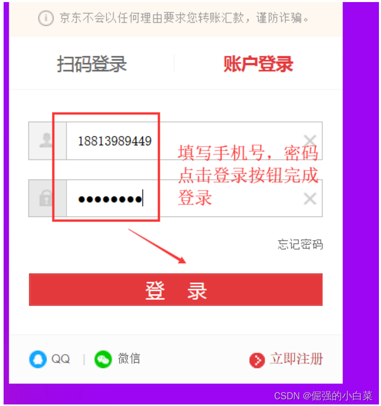 1.打开火狐浏览器,访问京东登录页面输入登录账号,密码完成登录:
