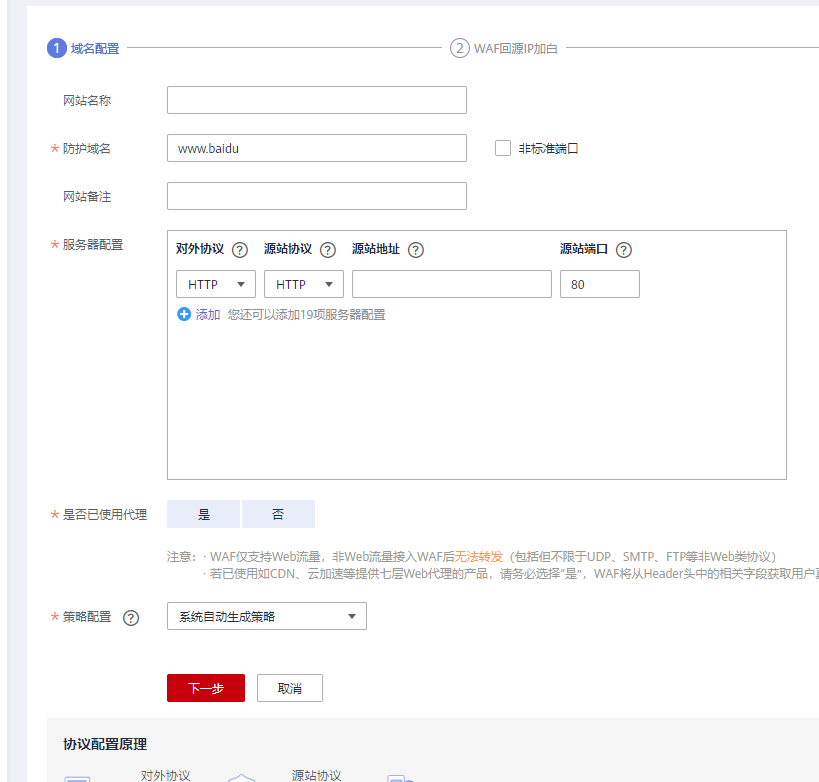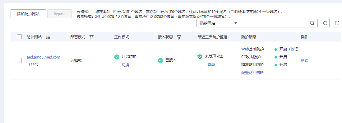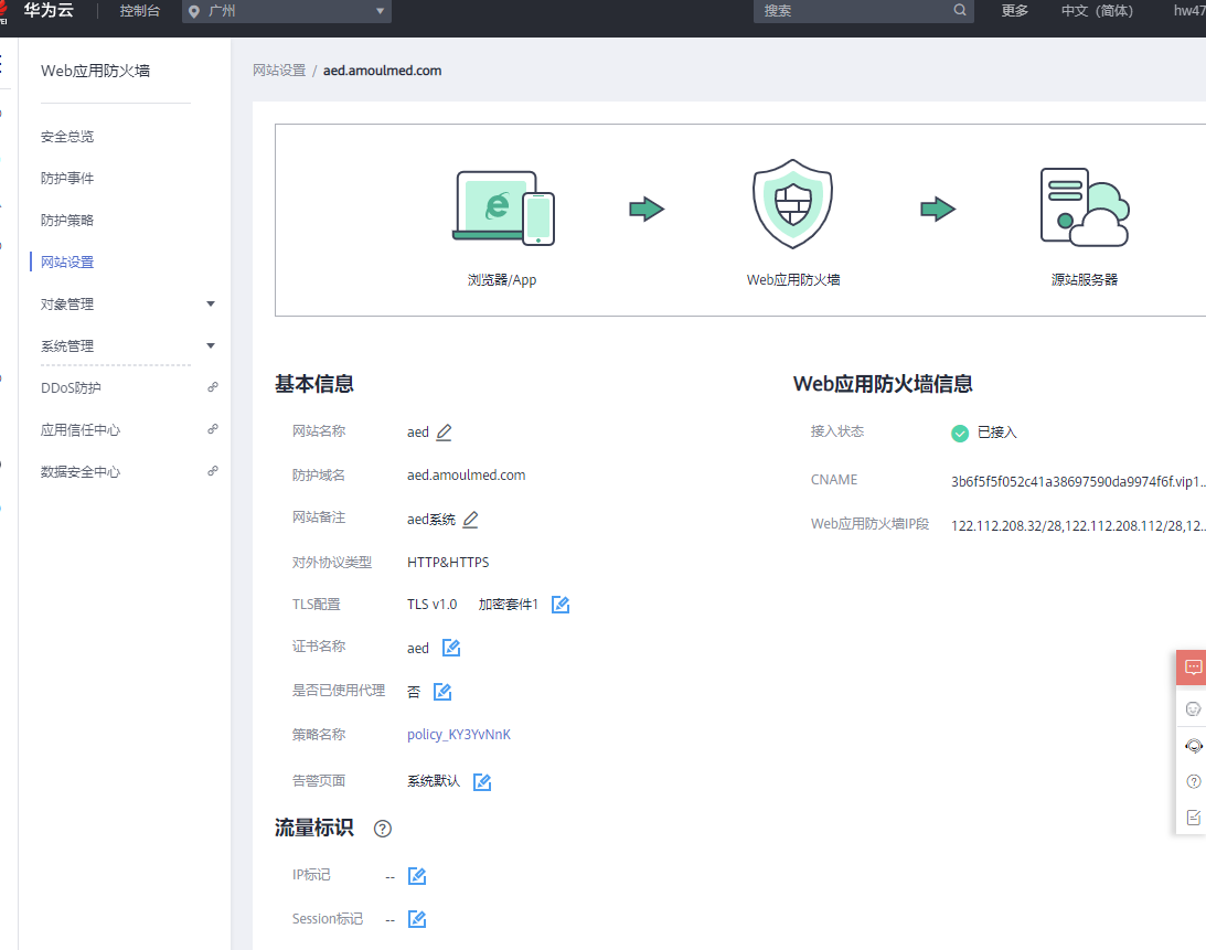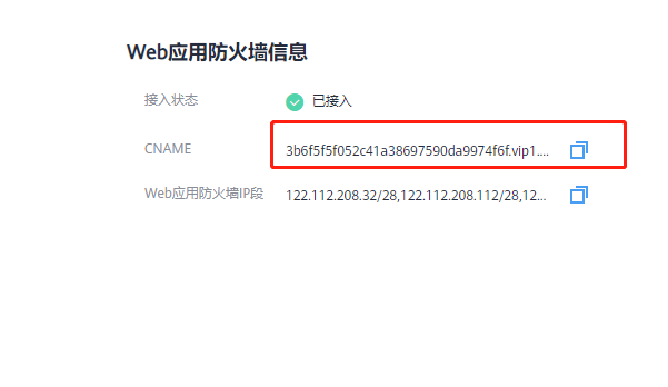 配置好WEB防火墙会生成CNAME,在域名配置dns解析那边解析选择cname使用复制的CNAME进行解析