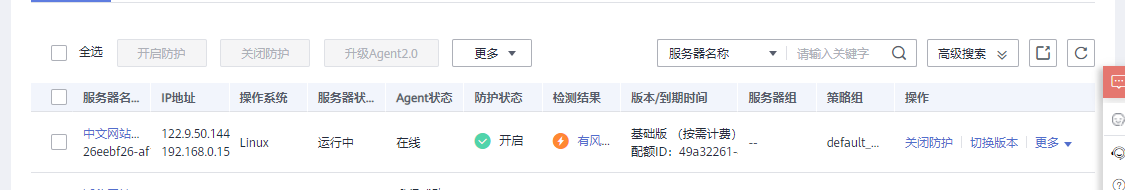 选择云服务器开启防护,如果没有配置agent,需要先配置,开启之后如图