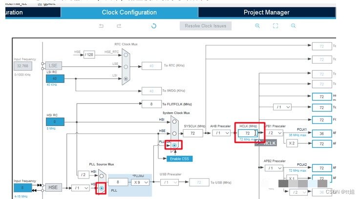 HCLK总线时钟处输入72,回车,配置使用最高时钟频率。