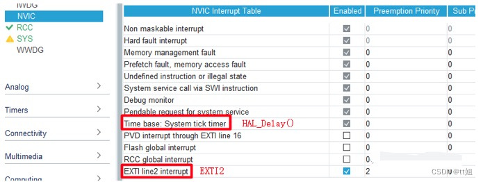 因为PE2配置为GPIO_EXTI2中断,它出现在了列表中。同时出现的还有SysTick,它是HAL_Delay的时基来源,如下图note处所说的,每隔一个固定时间产生一次中断。