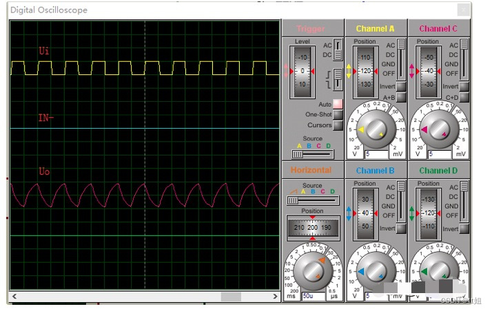 ❤如图19为积分运算仿真电路波形,其中IN-为运放-输入端的波形。