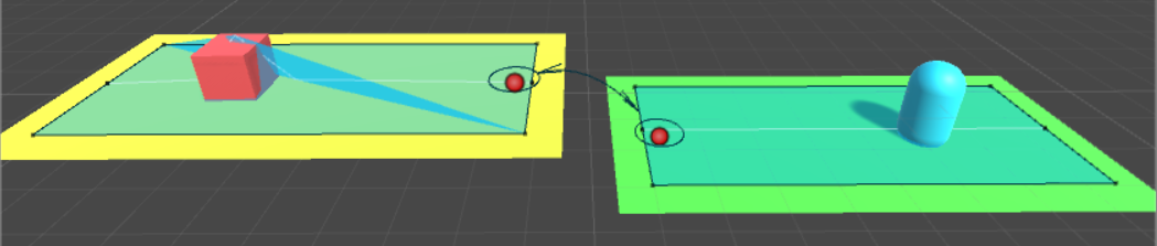 导航系统中介绍了导航的基本用法,但是不能解决分离路面导航问题。如下图,胶囊体需要导航到立方体位置,但是路面不连续,烘焙(Bake)导航网格后,断开处也没有导航网格,因此,胶囊体导航到分离路面边界处就会停下来。