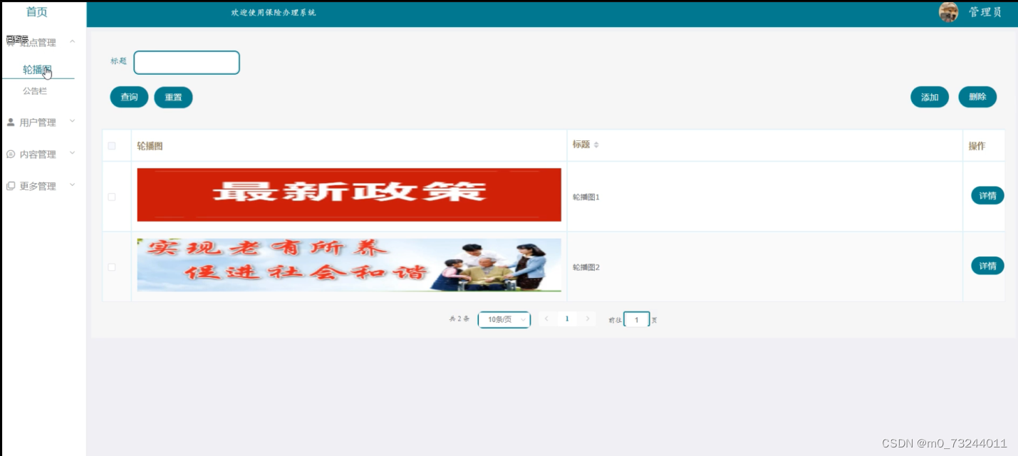 (4)站点管理:管理员可以对保险办理系统中首页显示的轮播图以及系统中的一些公告发布到系统当中,让用户及时的查看到系统信息,进行合理安排。