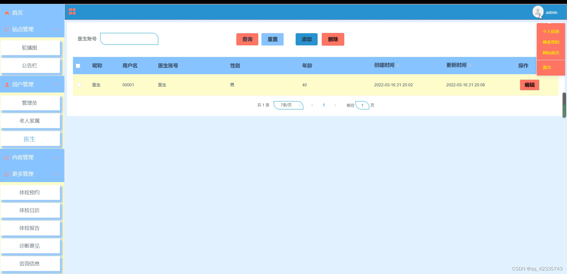 在管理员功能页面可以首页、站点管理(轮播图、公告栏)用户管理(管理员、老人家属、医生)内容管理(健康资讯、新闻分类列表)更多管理(体检预约、体检日历、体检报告、诊断意见、咨询信息、消息提醒)等内容进行相对应操作,如图5-5所示。