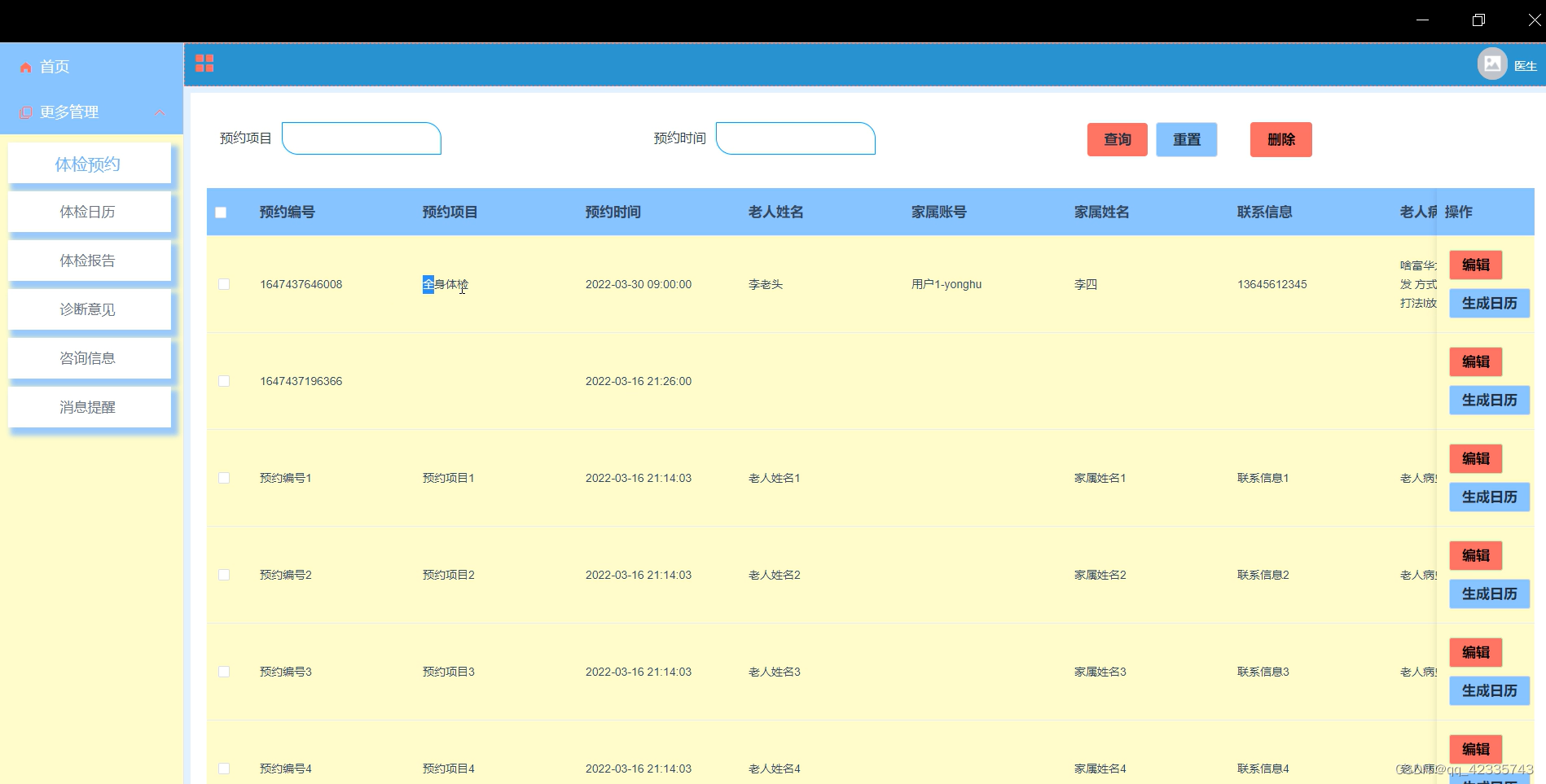 体检预约,在体检预约页面可以查看预约编号、预约项目、预约时间、老人姓名、家属账号、家属姓名、联系信息等内容,并可根据需要进行修改或删除操作,如图5-7所示。