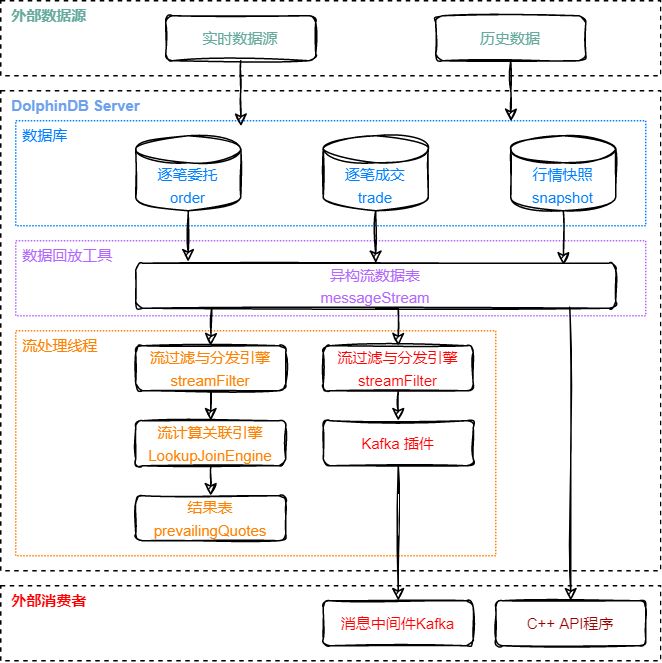 基于上文提到的异构回放、异构流数据表解析以及 DolphinDB 流处理框架中的其他特性等,本章将结合股票行情回放展示 DolphinDB 异构模式的多表回放功能在实际场景中的应用,包括数据回放以及三种具体的回放结果消费方案。