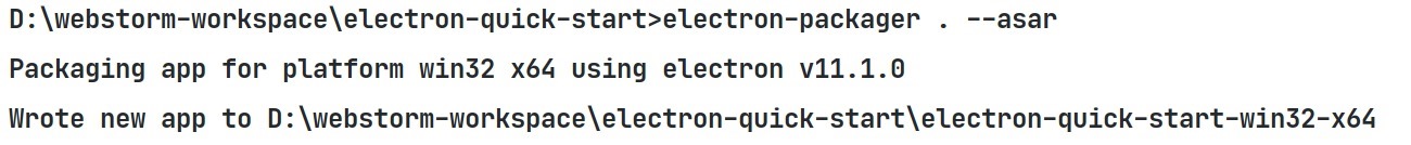 3、cd至上步目录中 执行命令 electron-packager . appTest --platform=win32 --arch=x64 --electron-version=8.0.3,因脚本需要下载依赖包,可能会有卡死假象,只要不报错,安静等待即可。(只有第一次因下载会慢,之后光速打包)出现下图即打包成功: