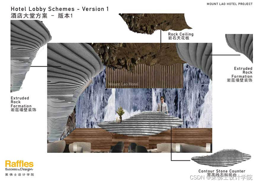 单从Cecilia多个版本的大堂设计,对该主题的诠释就可窥见一二,“岩石款”版本一中,大堂天花板使用褐色的岩石,两侧启用岩层墙壁装饰,就连柜台也是使用的等高线石料。