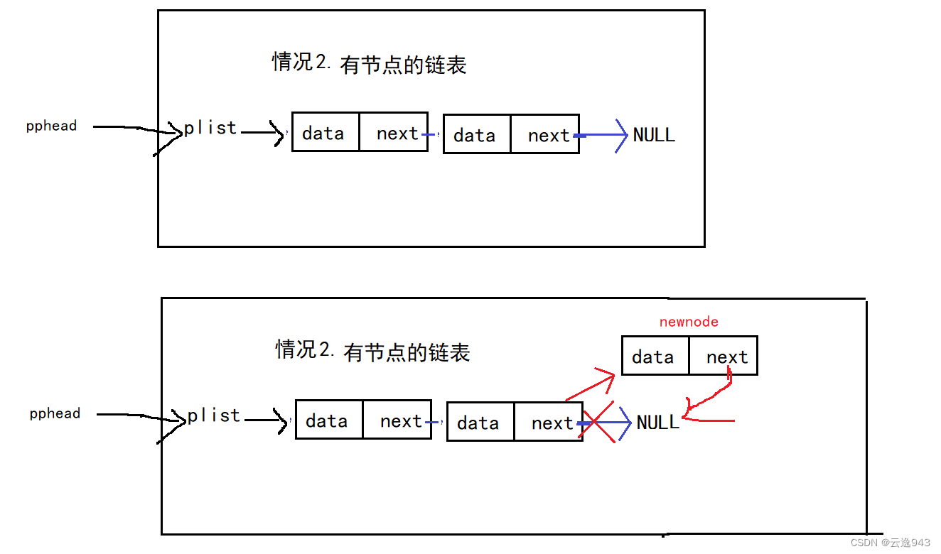 1.当前链表为空链表时,plist指向NULL,所以需要改变plist的指向,直接把新建的结点newnode地址交给plist即可。