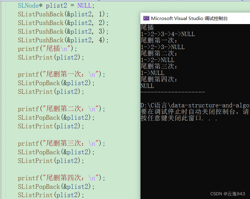情况二.当链表中有多个结点时,需要两个结点两个结点的跳跃寻找NULL,这次不需要二级指针,只用临时指针变量去遍历寻找NULL即可。找到NULL后,改变tail指向的下一个节点的指针域为NULL即可。
