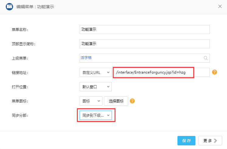 (3)输入“菜单名称”和“顶部显示简称”,并将“同步分部”选择为“同步到下级分部”。其中“顶部显示简称”即为显示到ecology顶部菜单的简称。
