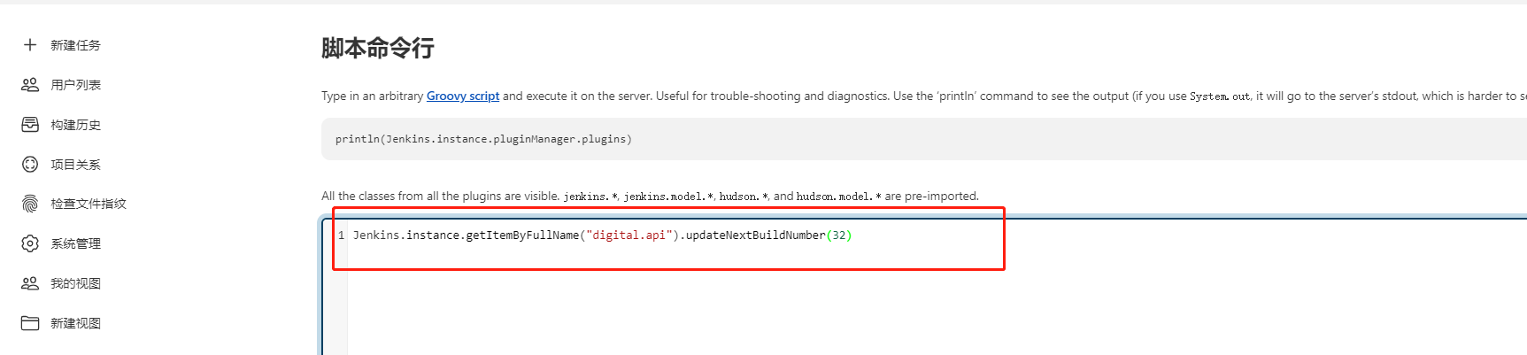 Jenkins.instance.getItemByFullName("任务名称").updateNextBuildNumber(版本数字)