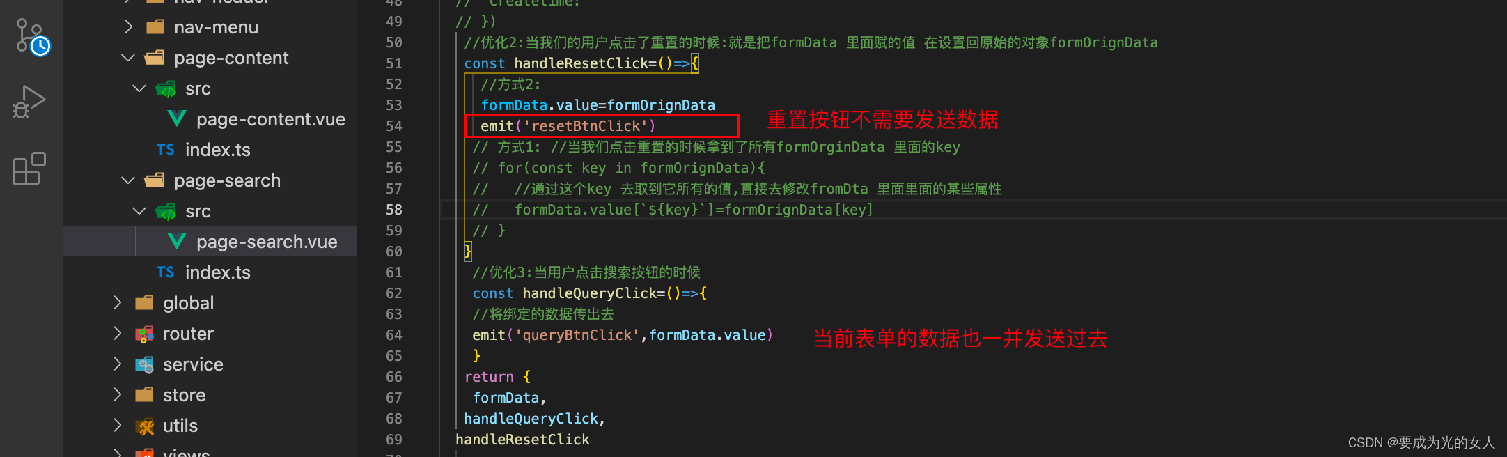 第四点:user页面有一个page-search 的组件 和 一个page-content 的组件,pageData的函数在pageContent 的里面的,搜索按钮是在page-search 的,就意味着在page-search.vue 页面点击搜索按钮时,需要在page-content.vue 页面调用一次 pageData 这个函数。