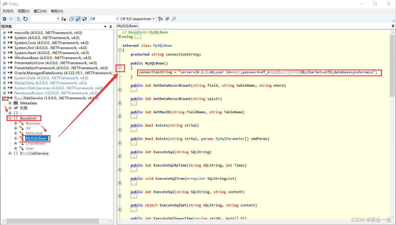 如下图,依次展开相关树结构中的节点,最终可以看到dll文件中包括的相关类的原代码,以及代码中的数据库连接字。