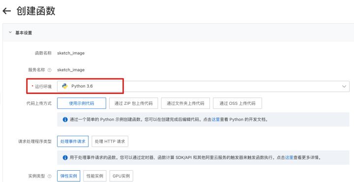 运行环境选择Python 3.6,代码上传方式选择使用示例代码,请求处理程序类型选择处理事件请求
