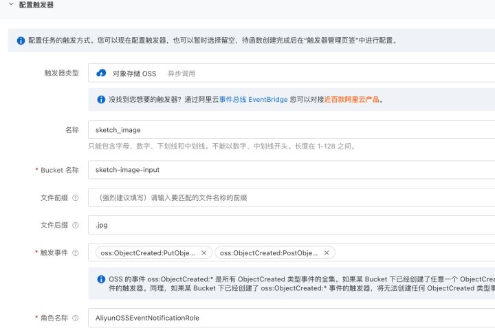触发器选择OSS,Bucket选择提前创建好的sketch-image-input,文件后缀为.jpg,防止其他类型的文件上传后误触发函数执行