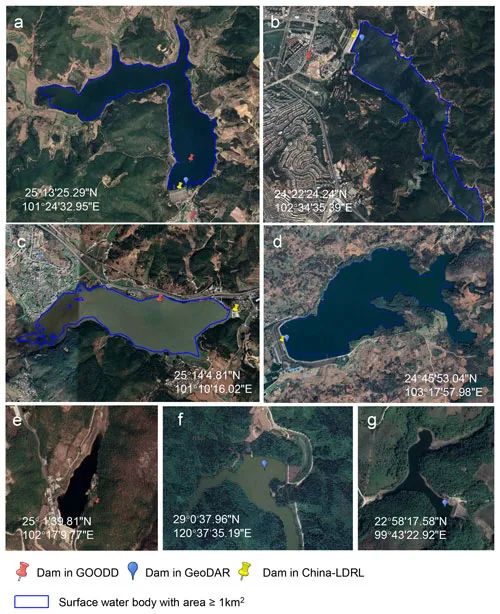 现有的 全球或国家大坝数据集具有较大的地理坐标偏移,一些数据集没有将水库和 湖泊分开。在生态崇明研究所等机构的这项研究中,生成了中国的地表水体, 大型水坝、水库和湖泊。China-LDRL数据集通过分析所 Google Earth Engine 和 Google 地球专业版中的超高空间分辨率图像。确定了2418座大型水坝,包括624座非流水坝和1794座在流水坝,2194座大型水库和3051个大型湖泊。总的来说,中国大部分的大坝和水库 分布于华南、华东和东北,而 大部分湖泊位于中国西部、长江下游流域和 中国东北。研究区域覆盖全国所有省级行政区划。由于澳门特别行政区和香港相对较小 离广东省很近,把它们合二为一进行统计分析。