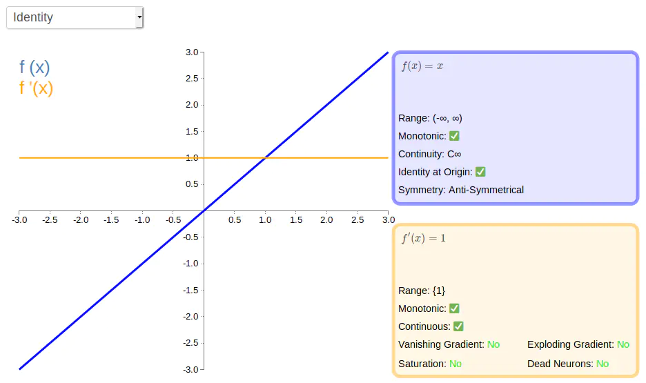 原点近似恒等函数(Approximates identity near the origin) 若激活函数有这一特性,神经网络在随机初始化较小的权重时学习更高效。若激活函数不具备这一特性,初始化权重时必须特别小心。