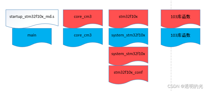 STM32的文件架构非常固定。其中红色部分是.h文件,蓝色部分是.C文件。