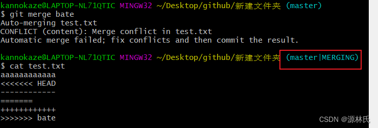 master分支是项目确定主分支,将bete合并到master,出现冲突提示