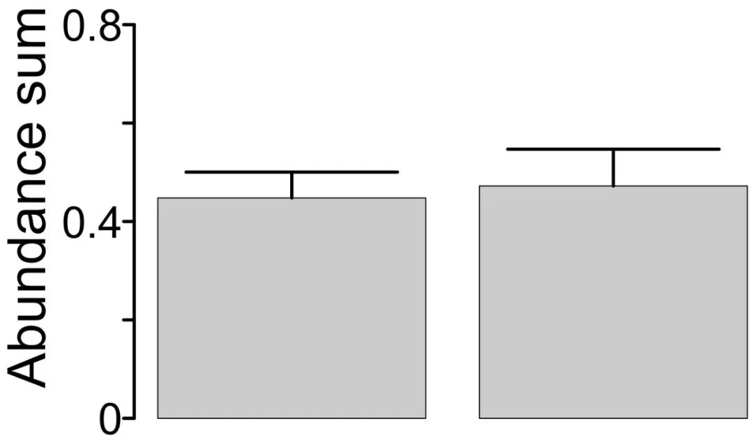 tiff(filename = "marker_abundance_diversity.tif",width = 5400,height = 7200,compression = "lzw",res = 600,type = "windows")par(mfrow = c(2,1))par(mar = c(5,7,1,1))par(xpd = TRUE)bar1 <- barplot(marker_abundance$Abundance,ylim = c(0,0.9),axes = FALSE,col = "grey80")axis(side = 2,at = c(0,0.2,0.4,0.6,0.8),labels = c("","","","",""),lwd = 3)text(x = 0.07,y = c(0,0.4,0.8),labels = c(0,0.4,0.8),cex = 2.5,adj = c(1,0.5))mtext(side = 2,text = "Abundance sum",line = 4,cex = 3)arrows(x0 = 0.7,y0 = 0.4478635,x1 = 0.7,y1 = 0.4478635+0.05248740,col = "black",angle = 90,length = 1,lwd = 3)arrows(x0 = 1.9,y0 = 0.4721783,x1 = 1.9,y1 = 0.4721783+0.07471587,col = "black",angle = 90,length = 1,lwd = 3)text(x = bar1,y = -0.12,labels = c("Disease","Healthy"),cex = 3.5)segments(x0 = 0.7,y0 = 0.55,x1 = 0.7,y1 = 0.75,col = "black",lwd = 3)segments(x0 = 0.7,y0 = 0.75,x1 = 1.9,y1 = 0.75,col = "black",lwd = 3)segments(x0 = 1.9,y0 = 0.75,x1 = 1.9,y1 = 0.58,col = "black",lwd = 3)text(x = 1.3,y = 0.8,labels = "NS",cex = 2.5)bar2 <- barplot(diversity$shannon,ylim = c(-12,0),axes = FALSE,col = "grey80")axis(side = 2,at = c(-12,-10,-8,-6,-4,-2,0),labels = c("","","","","","",""),lwd = 3)text(x = 0.07,y = c(-12,-8,-4,0),labels = c(-12,-8,-4,0),cex = 2.5,adj = c(1,0.5))mtext(side = 2,text = "Within-sample diversity",line = 4,cex = 3)arrows(x0 = 0.7,y0 = -8.946364,x1 = 0.7,y1 = -8.946364-0.5686171,col = "black",angle = 90,length = 1,lwd = 3)arrows(x0 = 1.9,y0 = -8.716364,x1 = 1.9,y1 = -8.716364-0.6158940,col = "black",angle = 90,length = 1,lwd = 3)segments(x0 = 0.7,y0 = -10,x1 = 0.7,y1 = -12,col = "black",lwd = 3)segments(x0 = 0.7,y0 = -12,x1 = 1.9,y1 = -12,col = "black",lwd = 3)segments(x0 = 1.9,y0 = -12,x1 = 1.9,y1 = -9.8,col = "black",lwd = 3)text(x = 1.3,y = -13,labels = "NS",cex = 2.5)dev.off()