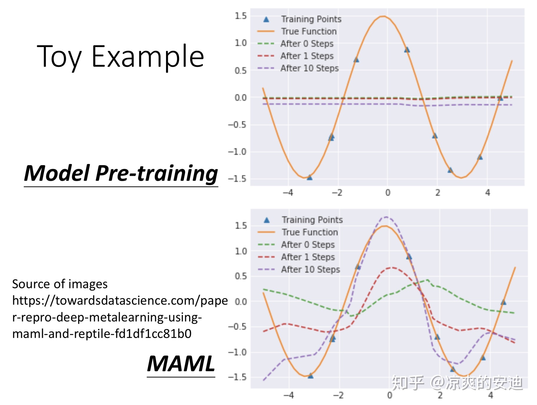 这里有一个toy example可以表现MAML的执行过程与model pretraining & transfer learning的区别。