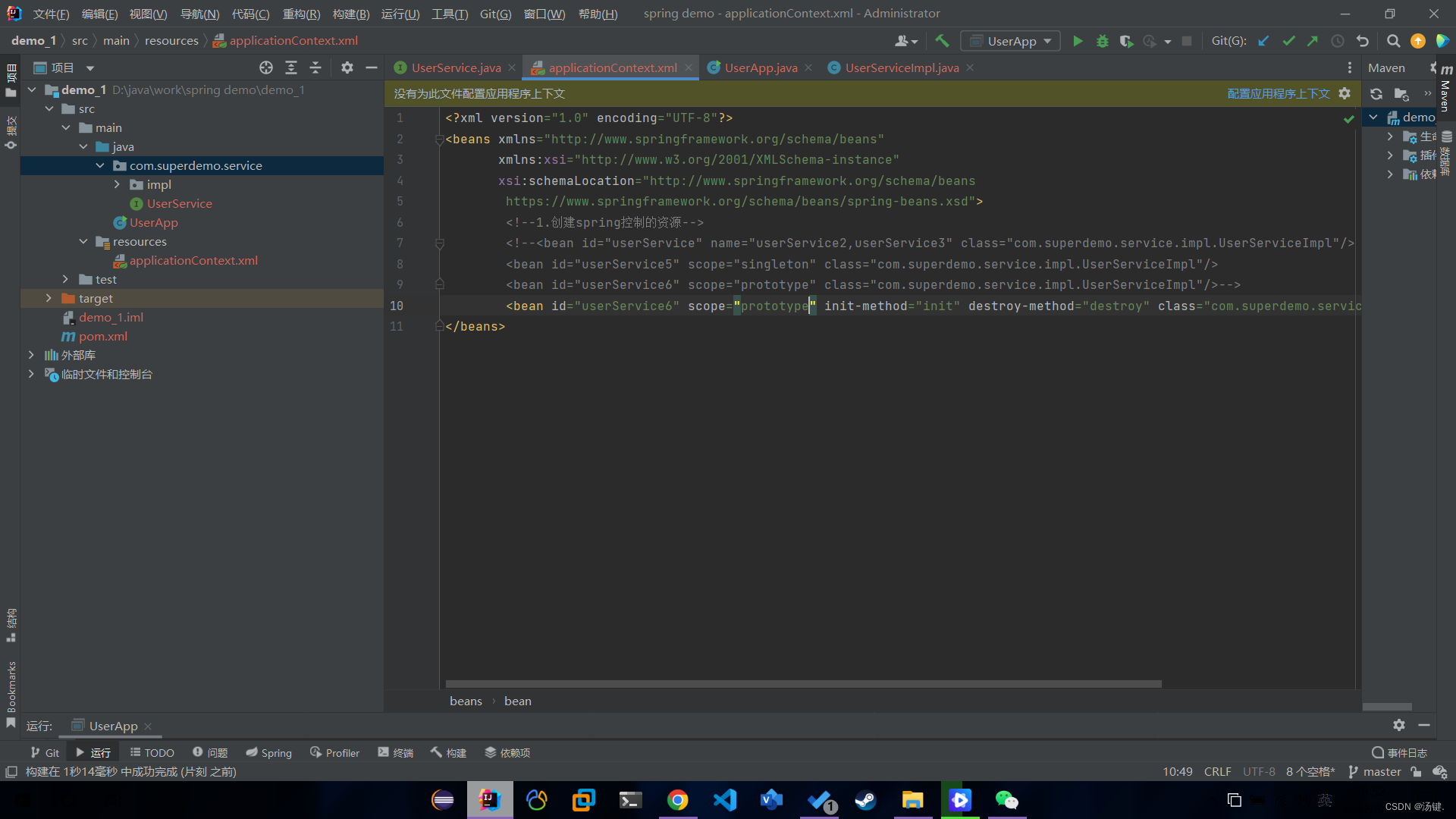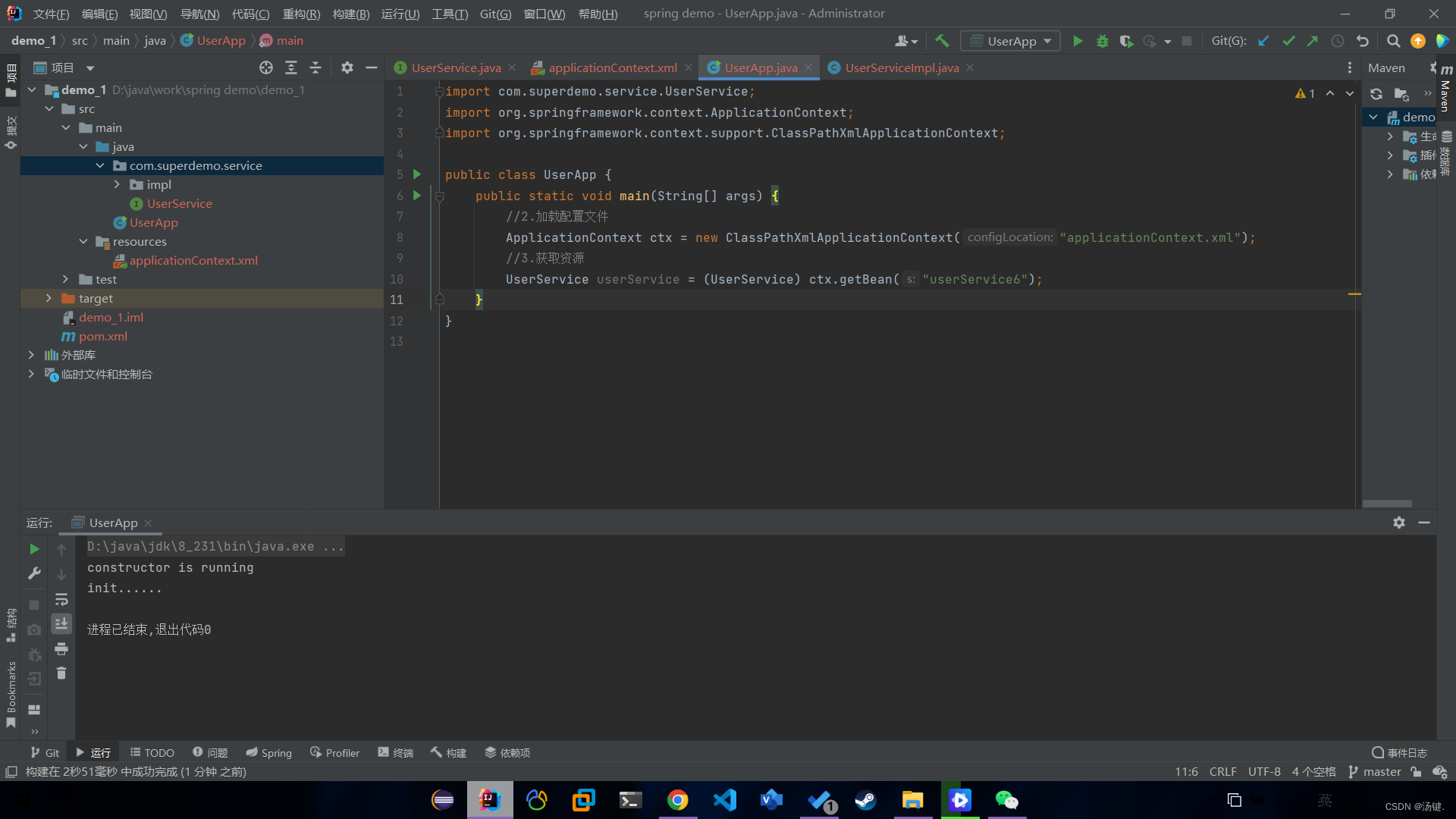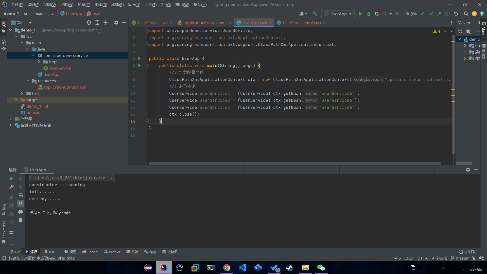通过在虚拟机结束前,强制把容器关了就能看到了(记得把ApplicationContext改为ClassPathXmlApplicationContext)