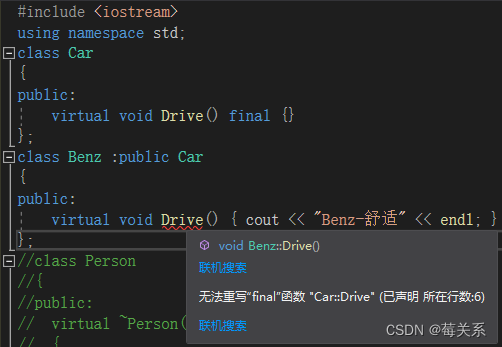 2、override: 检查派生类虚函数是否重写了基类某个虚函数,如果没有重写编译报错。
