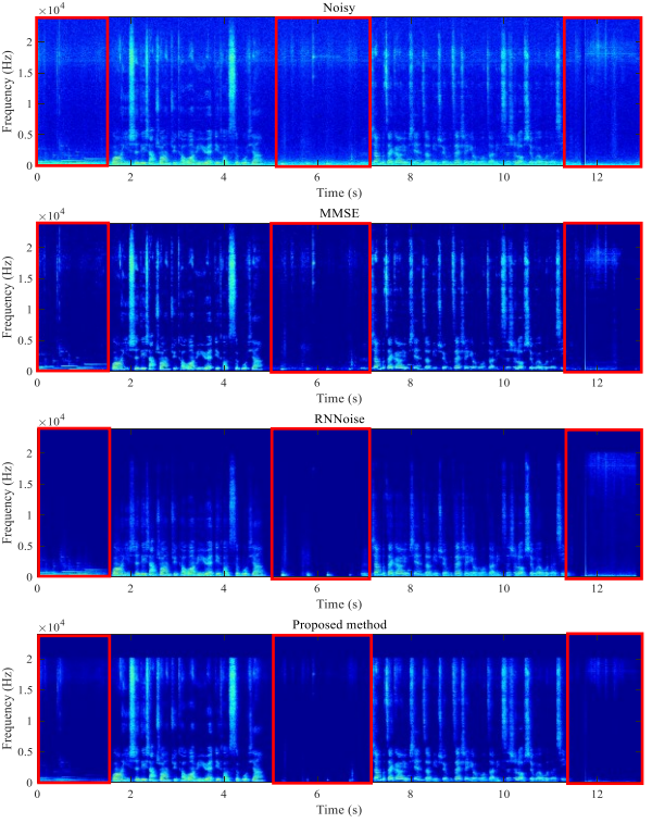 图2 将真实房间场景中记录的语料库的语谱图和基于mse、RNNoise和所提出方法的处理结果分别进行比较。