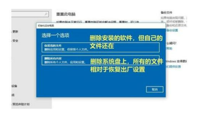3、根据自己情况选择。保留我的文件:删除电脑安装的任何软件,但是文件还在。删除所有内容:删除系统盘所用的文件。