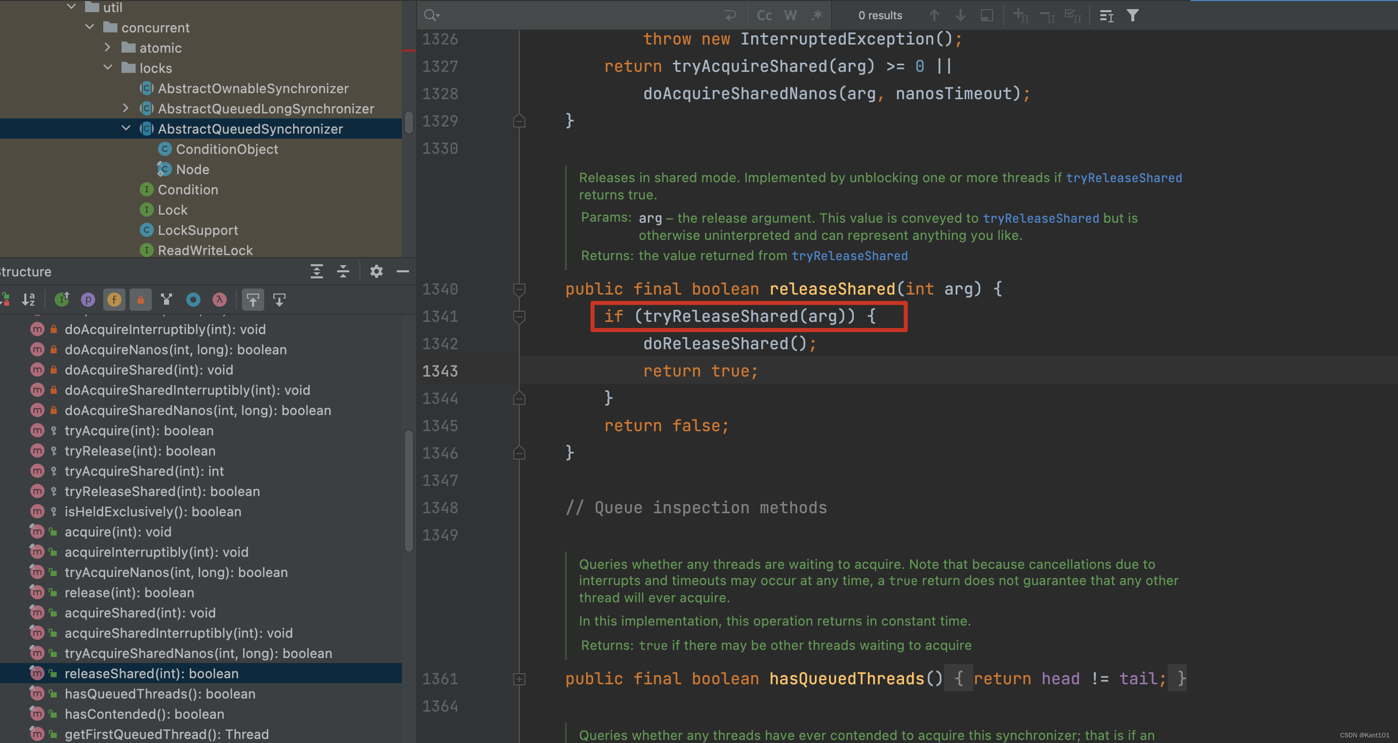 2)AQS中 acquireShared/releaseShared 方法实现的是共享锁,调 tryAcquireShared/tryReleaseShared 方法,同上,也是在实现类中具体实现的,调用时再动态绑定。