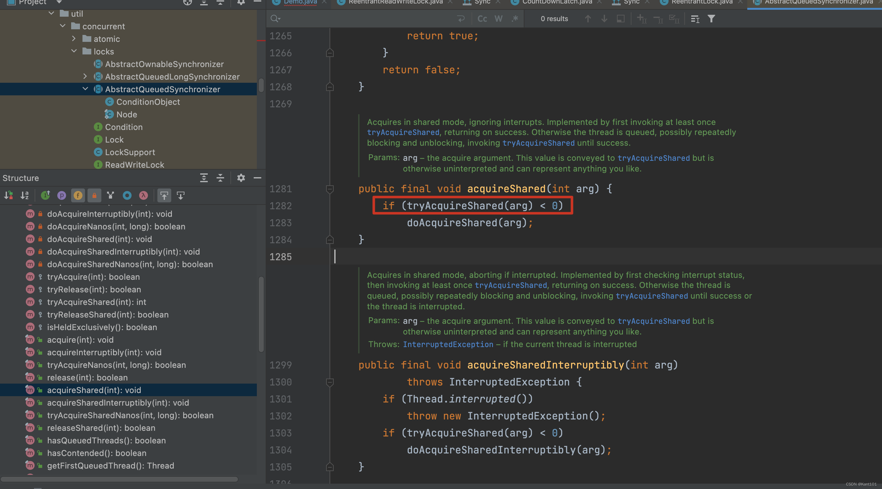 各个工具类中都自己写了一个Sync,公平锁和非公平锁还由Sync派生出了FairSync和NonfairSync,在这里面详细地写了 tryAcquire() / tryRelease() 和 tryAcquireShared() / tryReleaseShared() 的控制流程。