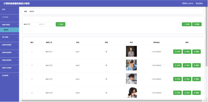 用户信息的添加和管理,计算机维修服务详细信息添加和管理和文档信息添加和管理以及系统信息管理,这些都是管理员的功能。